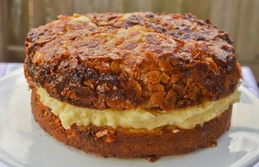 form two layers. Spread custard over bottom layer of cake. Top with other