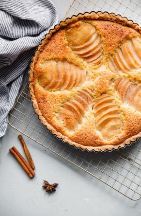 combined. Pour filling into tart crust. Slice the pear halves and fanning them over the batter. Bake the tart for 40 to 45 minutes, until the