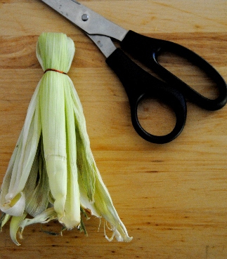 Turn upside down and pull long ends of husks down over the trimmed edges. See